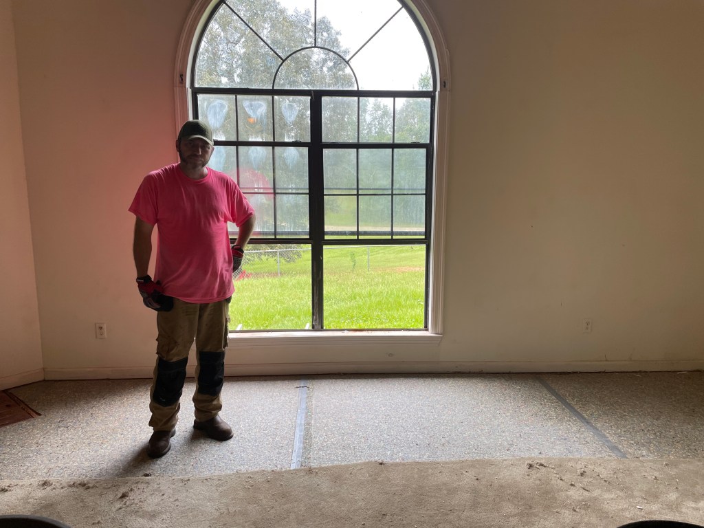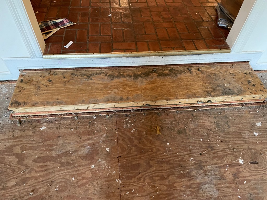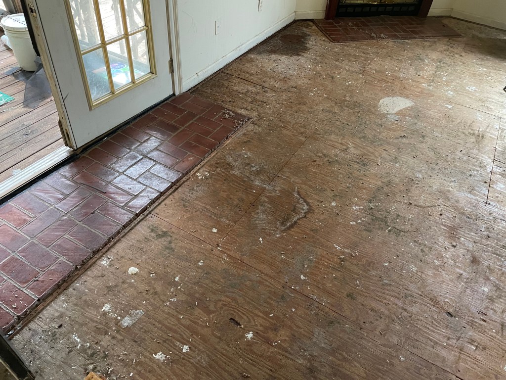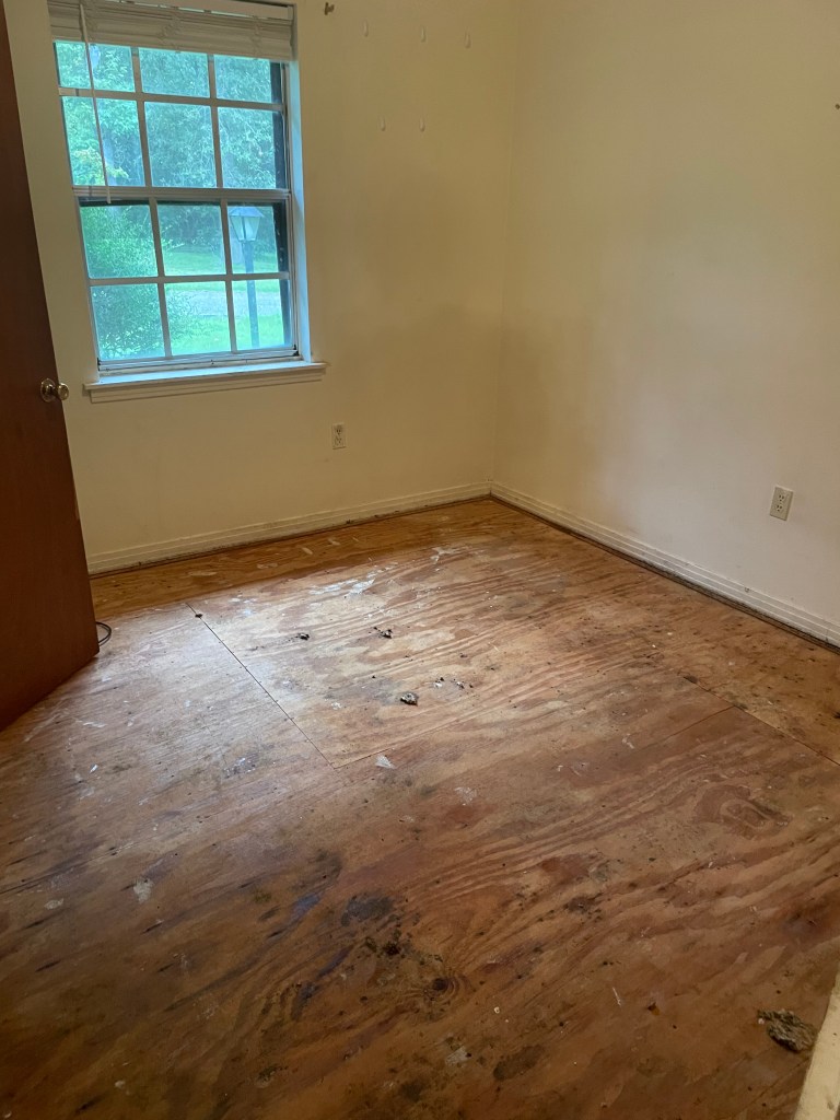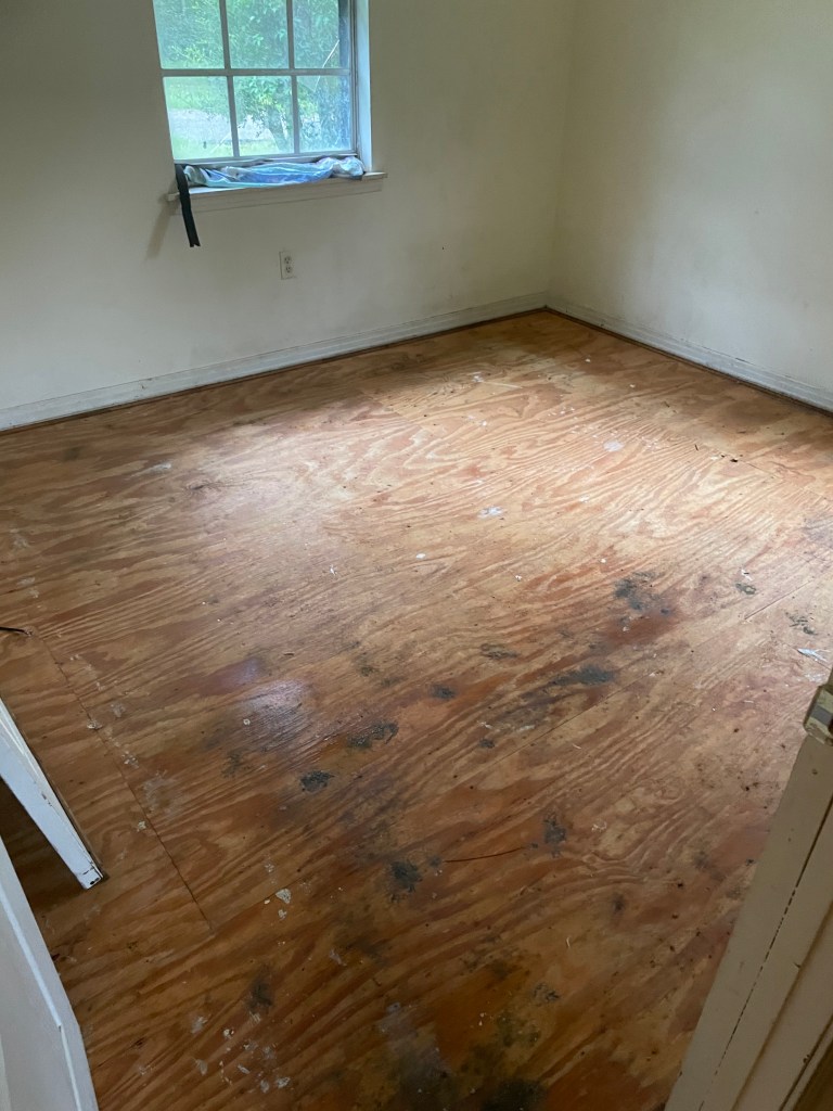We pulled all carpet out of the house and found a mold colony that a scientist would be jealous of. Mold in the living room, which was expected, and mold in all three bedrooms under the carpet. We made one other frightening discovery, each of the three bedrooms have locks on the OUTSIDE of the rooms. Not sure what or who was locked in, but we find that quite disturbing. Old appliances were removed to make way for walls to come down and the rest of the flooring to come out.