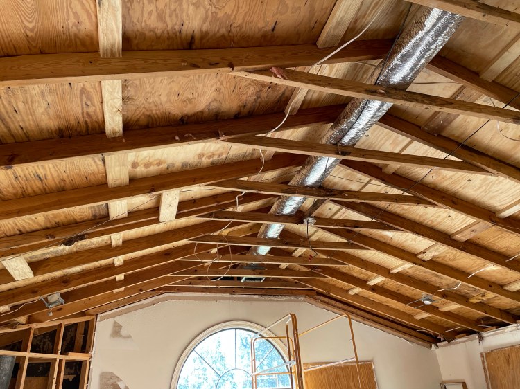 Only three things stand between us and a new roof: fixing the rotted facia board, laying down the purlins for the metal, and having the new gray metal roofing dropped on site.