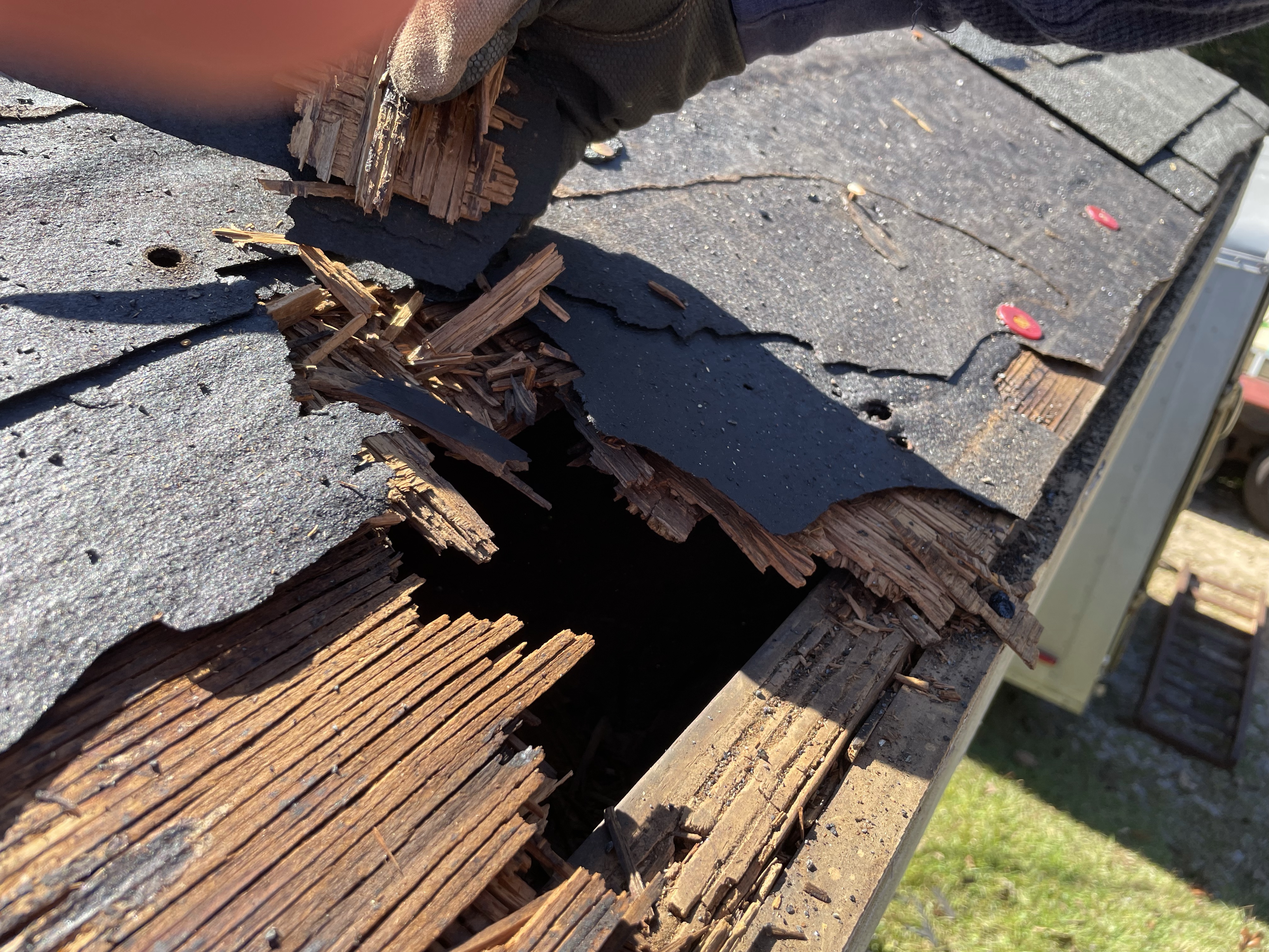 What is renovation rain you ask. . . it is rotten wood, wood so rotten when you grab it all you have in your hand is saw dust and it rains down on the ground below. We found more rot this weekend, so bad it was renovation rain.