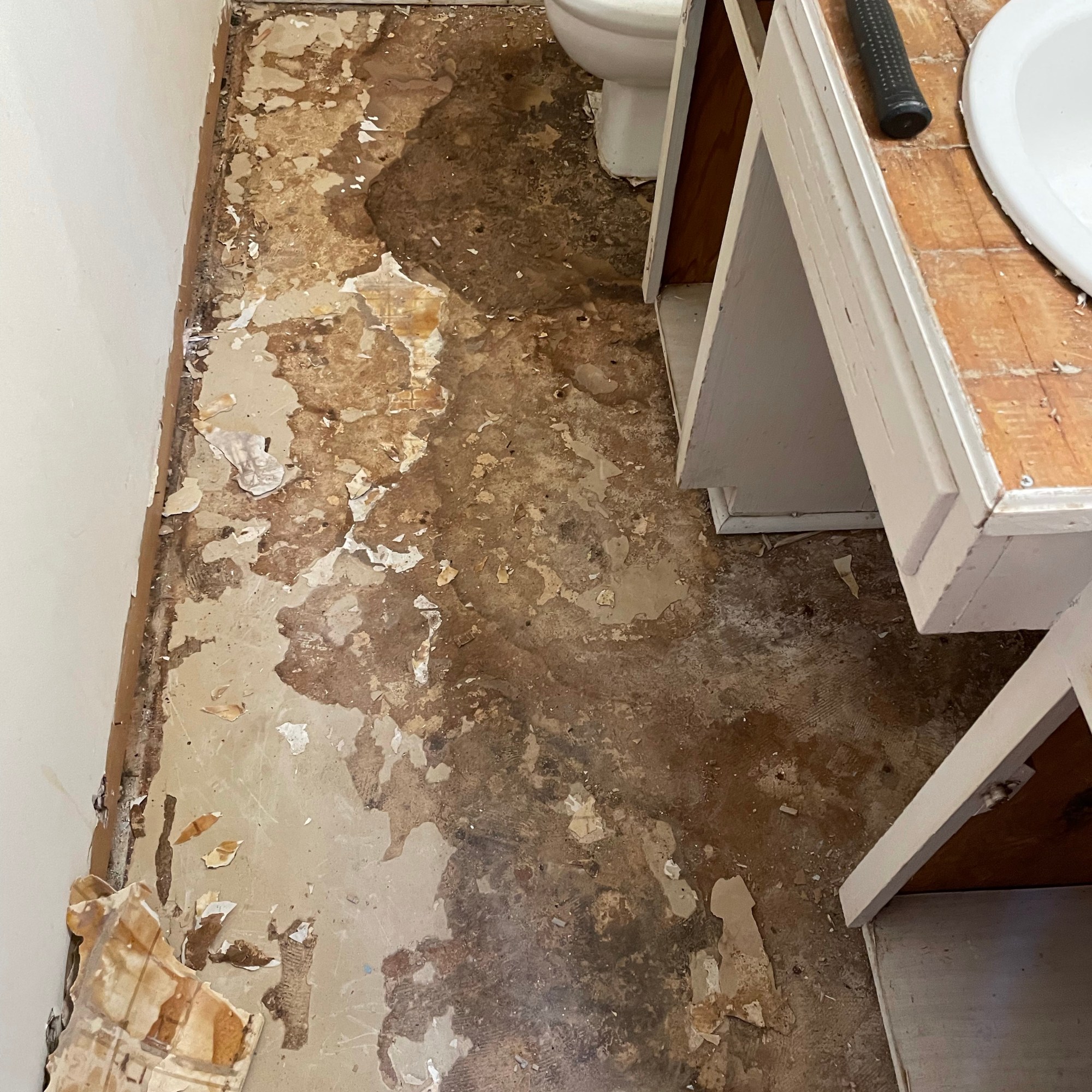 While Brady was having his fun on the roof and tearing out rot I set out on my own adventure. . . . The master bathroom. IT WAS NASTY! I demoed the trim, backsplash, ceramic tile on the vanity, and a layer of nasty linoleum. The smells were the worst part, by far. Every ceramic floor tile that came out threw up the strong scent of flowery bathroom cleaner and the layer of linoleum around the toilet reeked of ammonia when it broke free.
