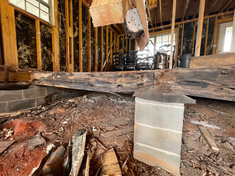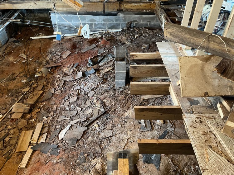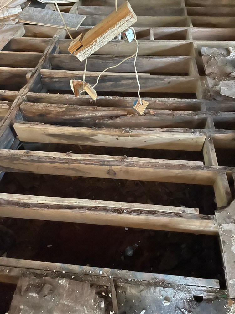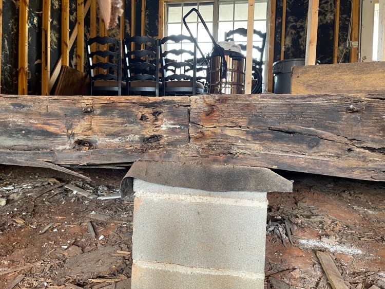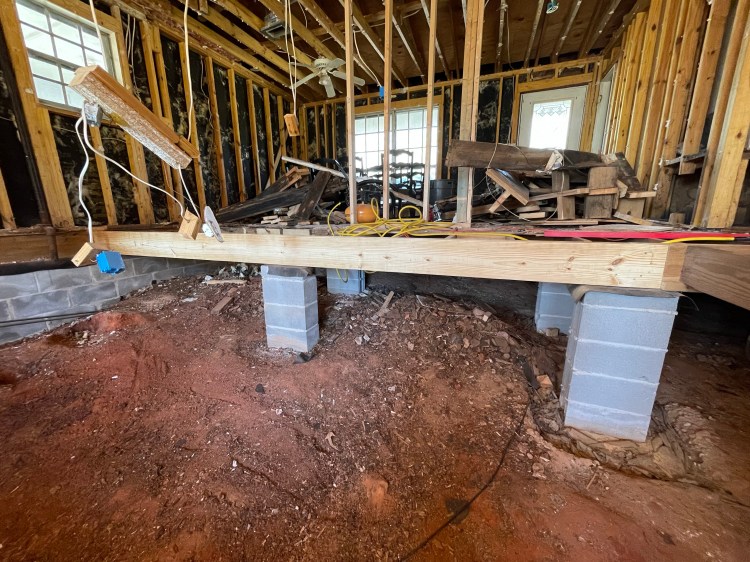 No new roof, but we do have non-rotten floor joists! The rain has not quit since the roof was dropped but Brady has single handedly replaced the rotten main beam and rehung floor joist on one side of the house. Everyone you watch do this sort of thing have a crew to help out, but not him. I was out of town while he worked on this huge project, so he literally did all of this by himself, a one-man construction crew. He’s amazing and I’m so glad he’s mine!