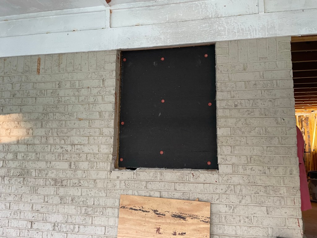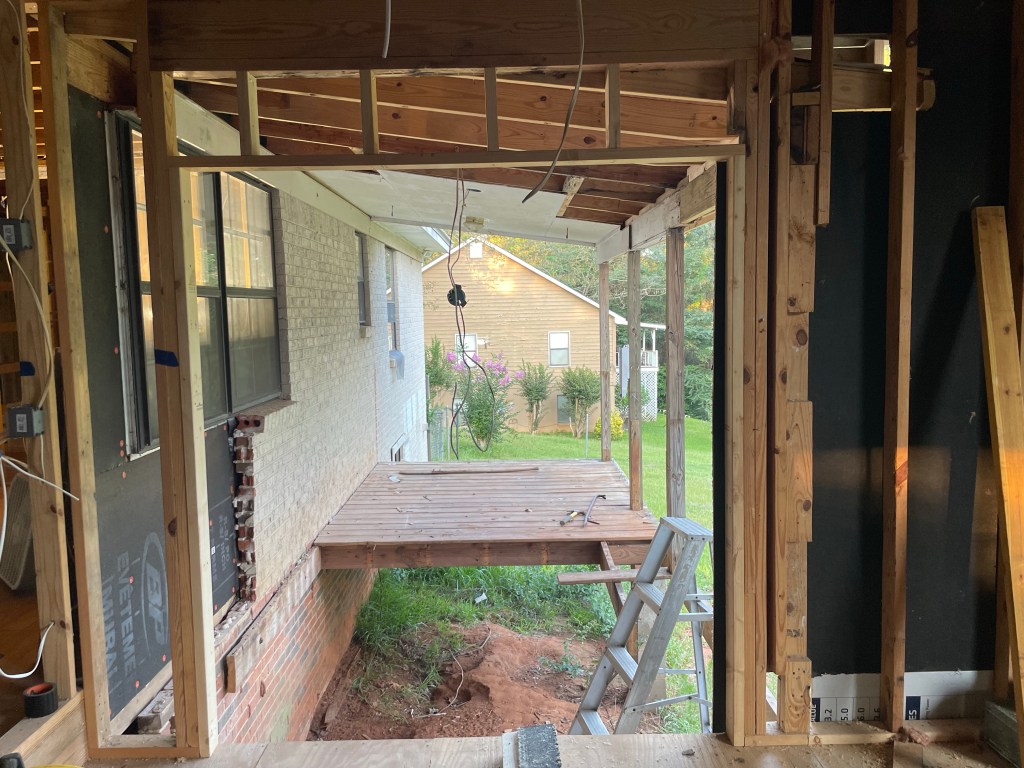 We also have the framing in for the first of two sets of French doors going into the house. The first set will open from the living room out to the screened porch/outdoor kitchen. We are starting to re-insulate the house starting with the open sections of exterior wall. Once the house is closed in and the HVAC is installed, we will start putting in fiberglass insulation and drywall.